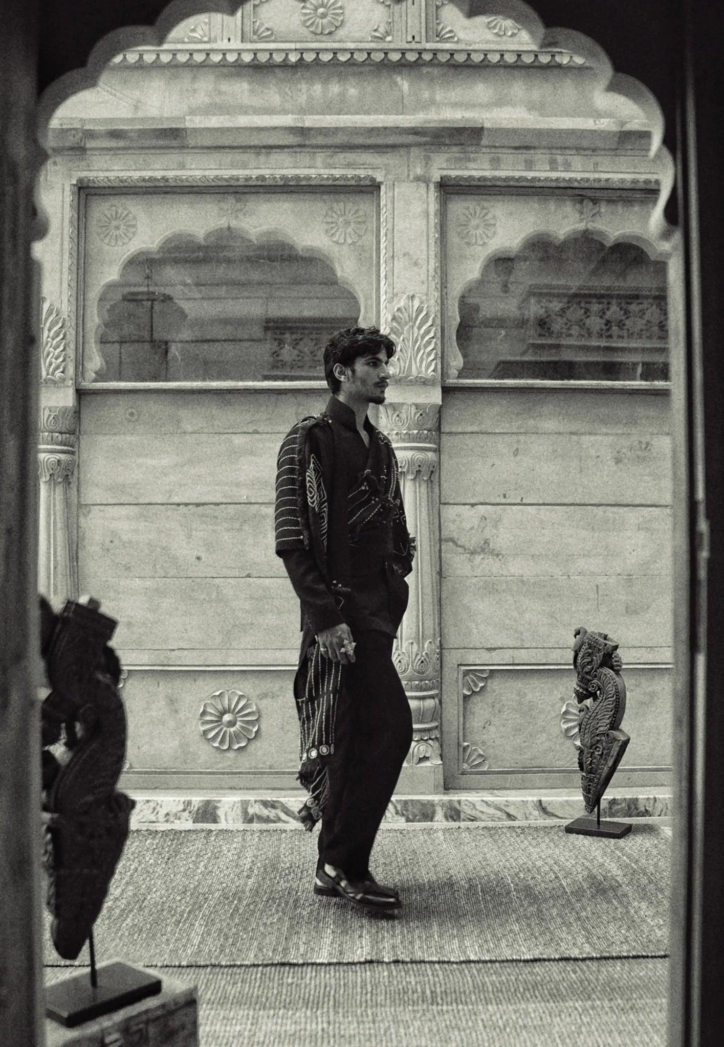 Woollen shawl with anchor embroidery, inspired from tribal marward tattoos, adorned with mirrors, oxidised silver embellishments and fine french knots. Paired with a high collared deep neck bandhgala and straight cut trousers.