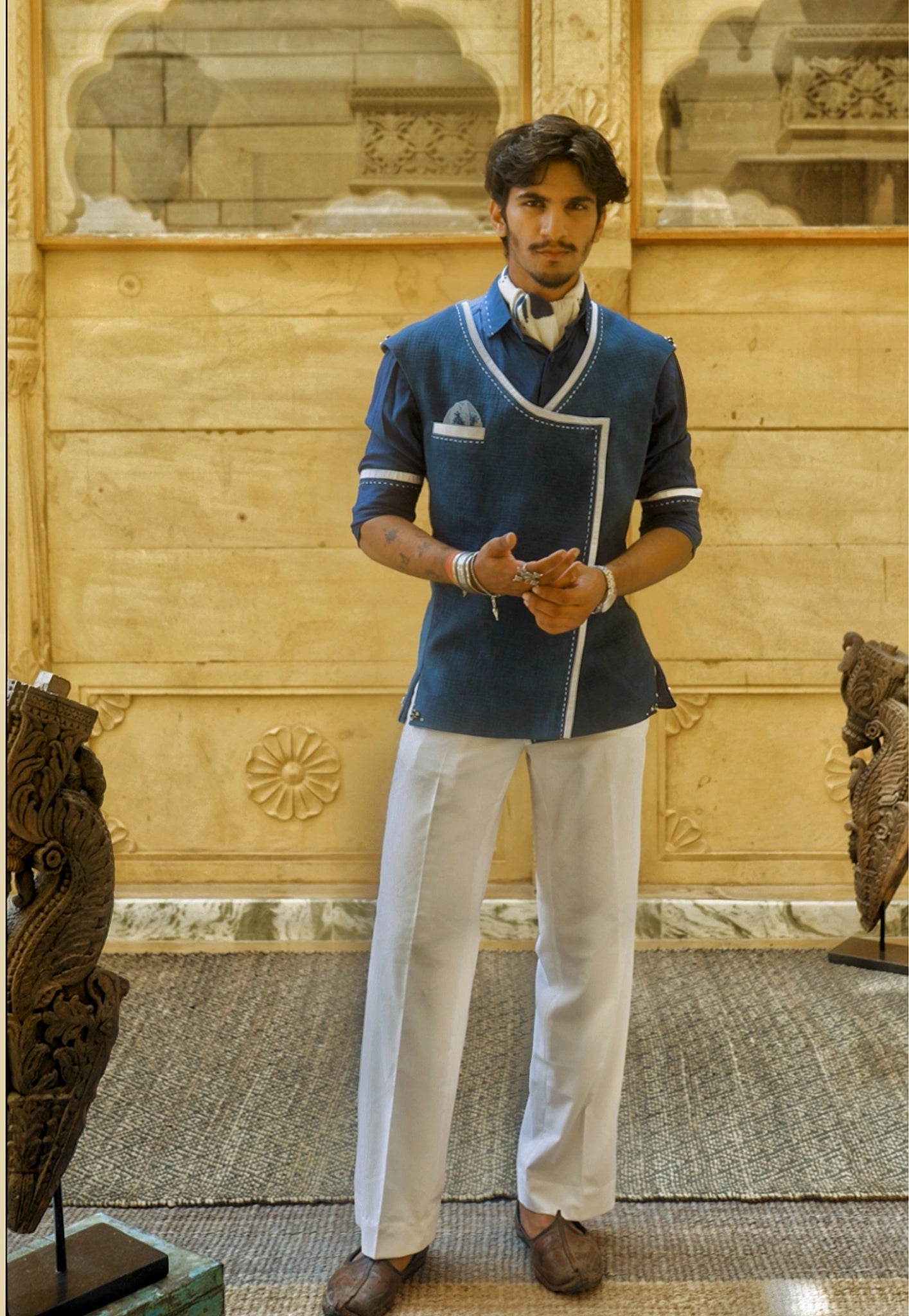 Asymmetrical Bandi dyed in natural Indigo with kantha details. Paired with natural Indigo dyed shirt with kantha details, hand-block printed cravat, hand embroidered pocket square and straight cut trousers.